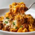 A comforting and hearty casserole made with egg noodles, ground beef, creamy tomato sauce, and gooey cheese, perfect for gatherings and family dinners.