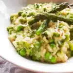 A creamy risotto featuring fresh asparagus and sweet peas, perfect for a comforting meal any time of year.