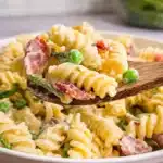 Bacon Ranch Pasta Salad has everything you want in a summer dish: it’s cool, refreshing, packed with flavor, and oh-so-easy to prepare. Once you sink your fork into that spiraled pasta, adorned with bits of savory bacon, sweet peas, and a richness that only creamy ranch dressing can provide, you’ll find yourself lost in blissful satisfaction.
