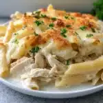 A comforting casserole featuring creamy Alfredo sauce, shredded chicken, and melted cheese, perfect for busy weeknight dinners.