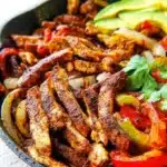 Delicious Chicken Fajitas with tender chicken strips, roasted peppers, and spices, perfect for a quick and flavorful meal.