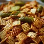 A tangy and crunchy gluten-free snack that combines Rice Chex, Corn Chex, and delicious dill pickle seasoning.