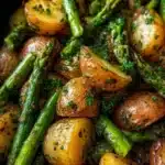 A delightful and easy one-pan dish featuring roasted baby potatoes and asparagus, infused with garlic and herbs.