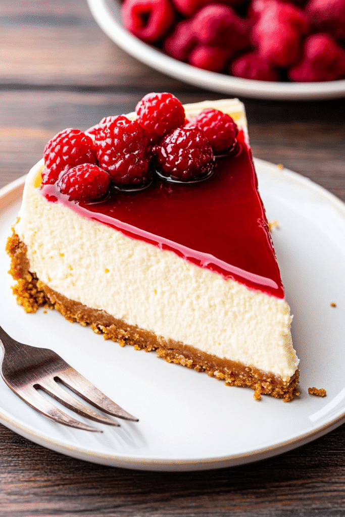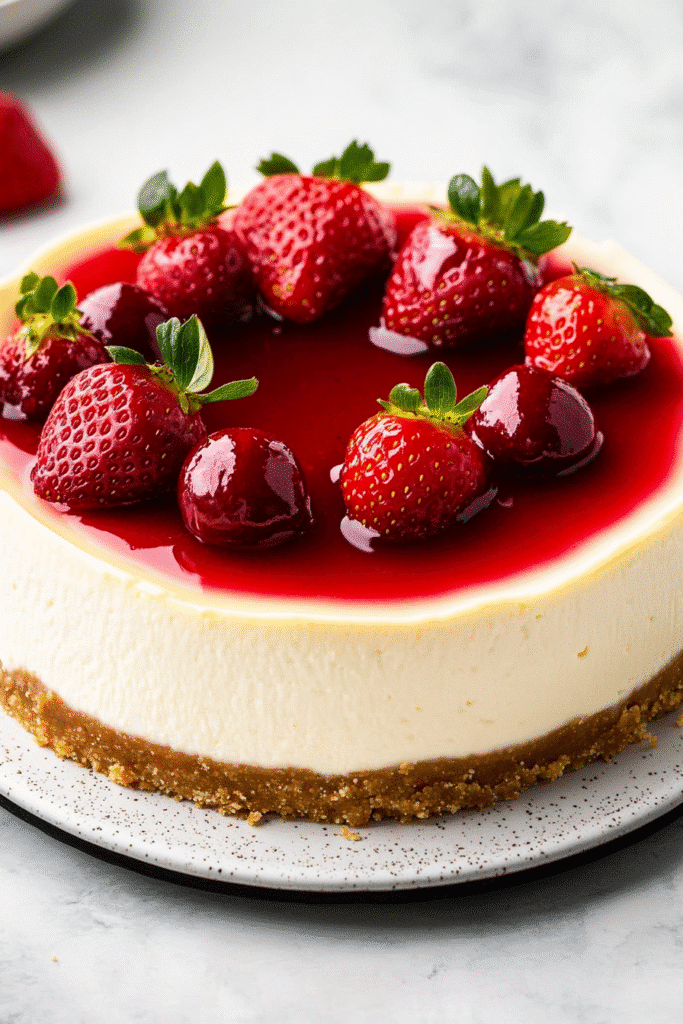 This cheesecake is all about balance: a crisp golden crust, a creamy vanilla filling, and a jewel-like berry topping that makes it as beautiful as it is delicious.