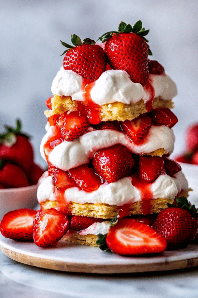 Instead of biscuits, use a tender gluten-free pound cake as your base. Slice it thick, spoon strawberries and syrup over the top, and finish with cream. It’s a heartier, more indulgent version reminiscent of Italian sponge desserts — and if you enjoy this, you’ll also love our gluten-free pound cake.