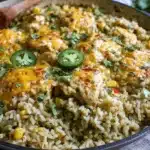 A comforting one-pan meal loaded with Mexican-inspired flavors, featuring chicken, rice, corn, and salsa verde.