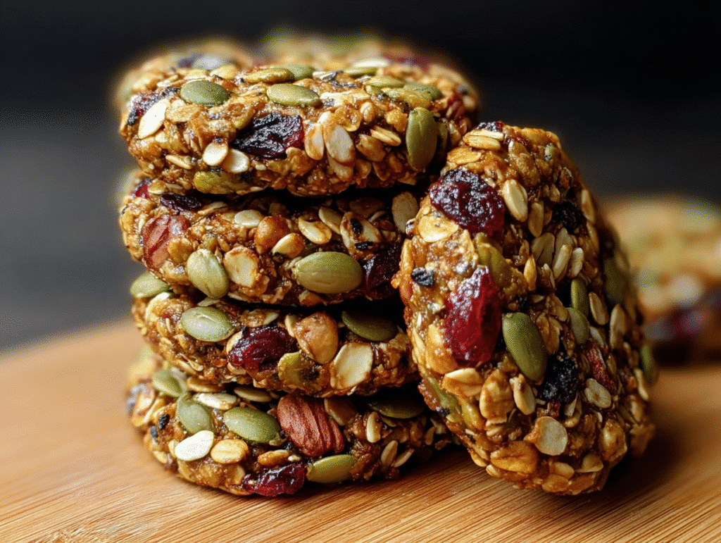 Delicious and nutritious cookies packed with oats, dried fruits, nuts, and seeds, perfect for a healthy snack.
