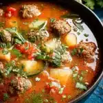 A hearty and comforting Mexican Meatball Soup filled with flavorful meatballs, fresh vegetables, and rich broth.