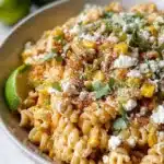 A vibrant and gluten-free pasta salad inspired by traditional Mexican street corn, featuring sweet corn, zesty lime, and creamy cotija cheese.