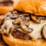 A deliciously rich burger featuring juicy beef patties topped with sautéed mushrooms, onions, and Swiss cheese, perfect for any family dinner or barbecue.