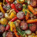 A comforting one-pan dish combining kielbasa and vibrant vegetables, glazed with honey and garlic for a delightful family meal.