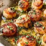 A luxurious yet approachable dish featuring perfectly seared scallops with a crispy exterior and tender center, enhanced by garlic and lemon.