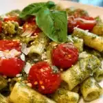 There’s something about the simplicity of Pesto Pasta with Cherry Tomatoes that warms my heart. The vivid green hues of the basil and the cheerful cherry tomatoes remind me of lazy summer afternoons spent in Italy, where time slows down, and each meal becomes an occasion. This dish transports me back to those moments, where every bite captures the fragrance of basil and the sweetness of sun-ripened tomatoes.