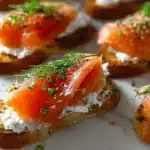 Easy Smoked Salmon Crostini has its roots deep in the rich culinary traditions of the Mediterranean and Nordic countries, where fresh seafood and artisan bread merge to create something spectacular. Crostini, meaning “little crusts” in Italian, are small pieces of toasted bread, often topped with savory ingredients. Smoked salmon—known for its luxurious feel and complex flavor profile—pairs beautifully with various spreads and toppings. The amalgamation of smoked fish, creamy spreads, and crunchy bread exemplifies a timeless addition to appetizers or snack platters.