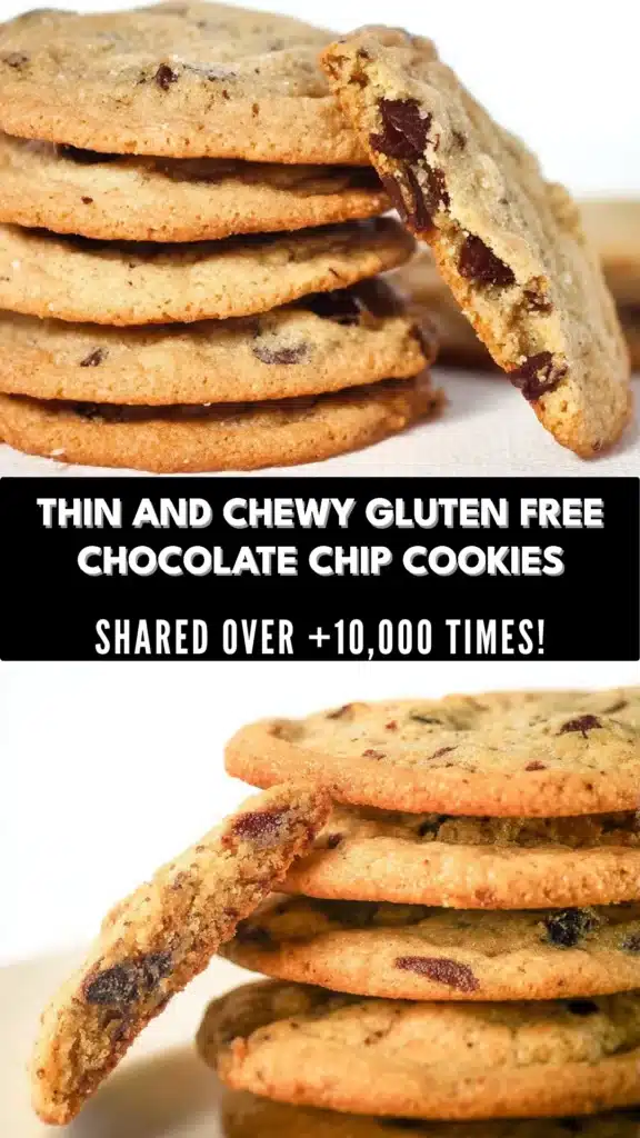 Delightful Thin and Chewy Gluten Free Chocolate Chip Cookies with crispy edges and a soft, chewy center, made for everyone to enjoy.